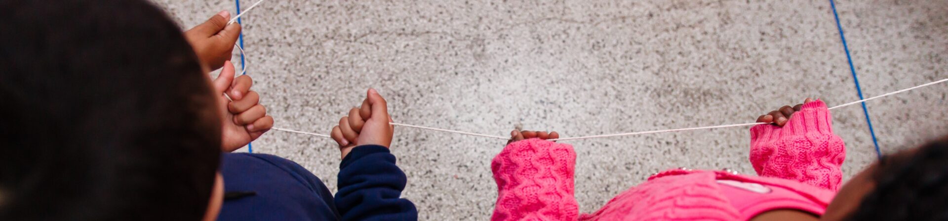Descrição da imagem: Uma foto tirada de cima (plano plongée), focando nas mãos e braços de duas crianças vestindo uniformes azuis escuros. As crianças estão manipulando um pedaço de barbante branco entre si, criando uma figura geométrica ou uma